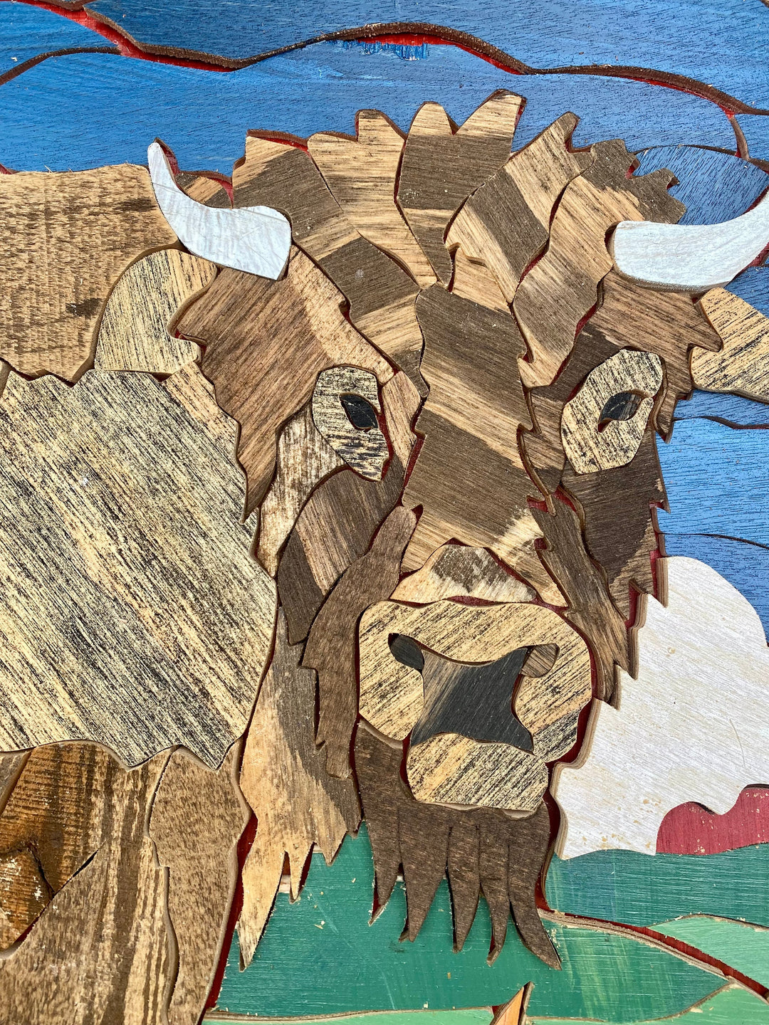 Experience the stunning detail captured in this high-definition photograph of an original work of art created by A.D. Hogan. This one-of-a-kind print, with its jaw-dropping quality and archival-grade materials, brings Hogan's singular vision to life. With odorless, water-based ink and a matte paper finish, this print is perfect for showcasing the artist's intricate, nearly 3 ft x 4 ft mosaic made of reclaimed wood. The reclaimed wood's natural imperfections and rough-hewn edges lend charm and character to the finished product, adding to its unique appeal.
